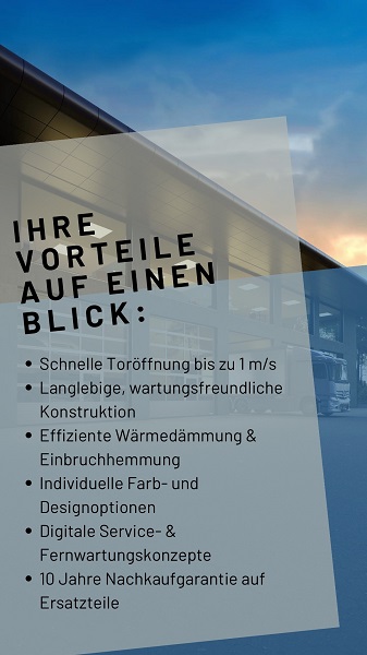 Die neue Baureihe 60 bietet höchste Qualität bei Montagefreundlichkeit und Geschwindigkeit. Dank smarter Steuerungstechnik und Bluetooth-Support lassen sich die Tore einfach in digitale Wartungskonzepte integrieren –ideal für die Anforderungen von Industrie 4.0.